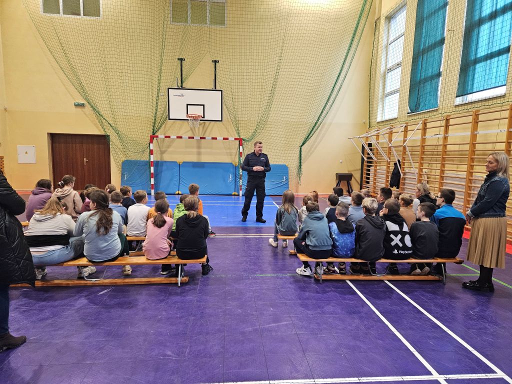 Funkcjonariusz opowiedział o swojej pracy oraz o tym, jak ważne jest przestrzeganie zasad obowiązujących w szkole. Uczniowie dowiedzieli się, jak należy zachowywać się wobec nauczycieli i kolegów, jak reagować w trudnych sytuacjach oraz dlaczego warto być uprzejmym i pomagać innym. Policjant przypomniał również zasady bezpiecznego poruszania się po drodze i konieczność noszenia elementów odblaskowych.