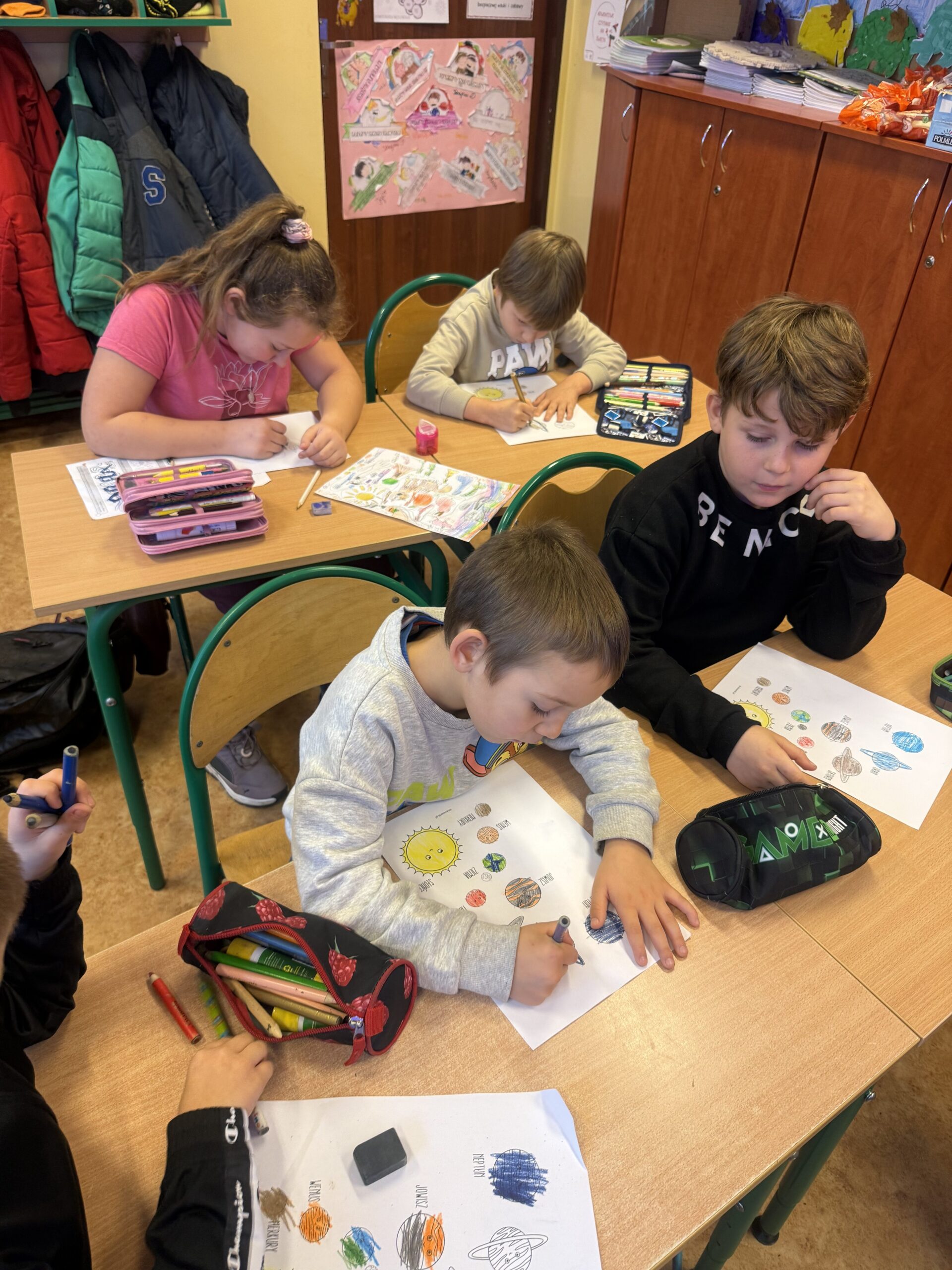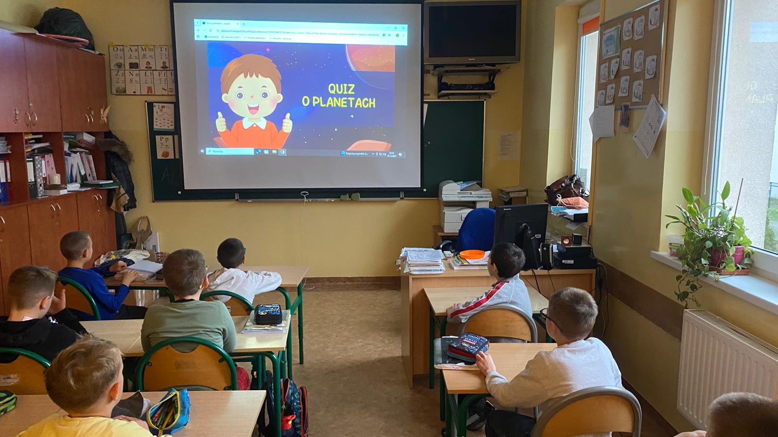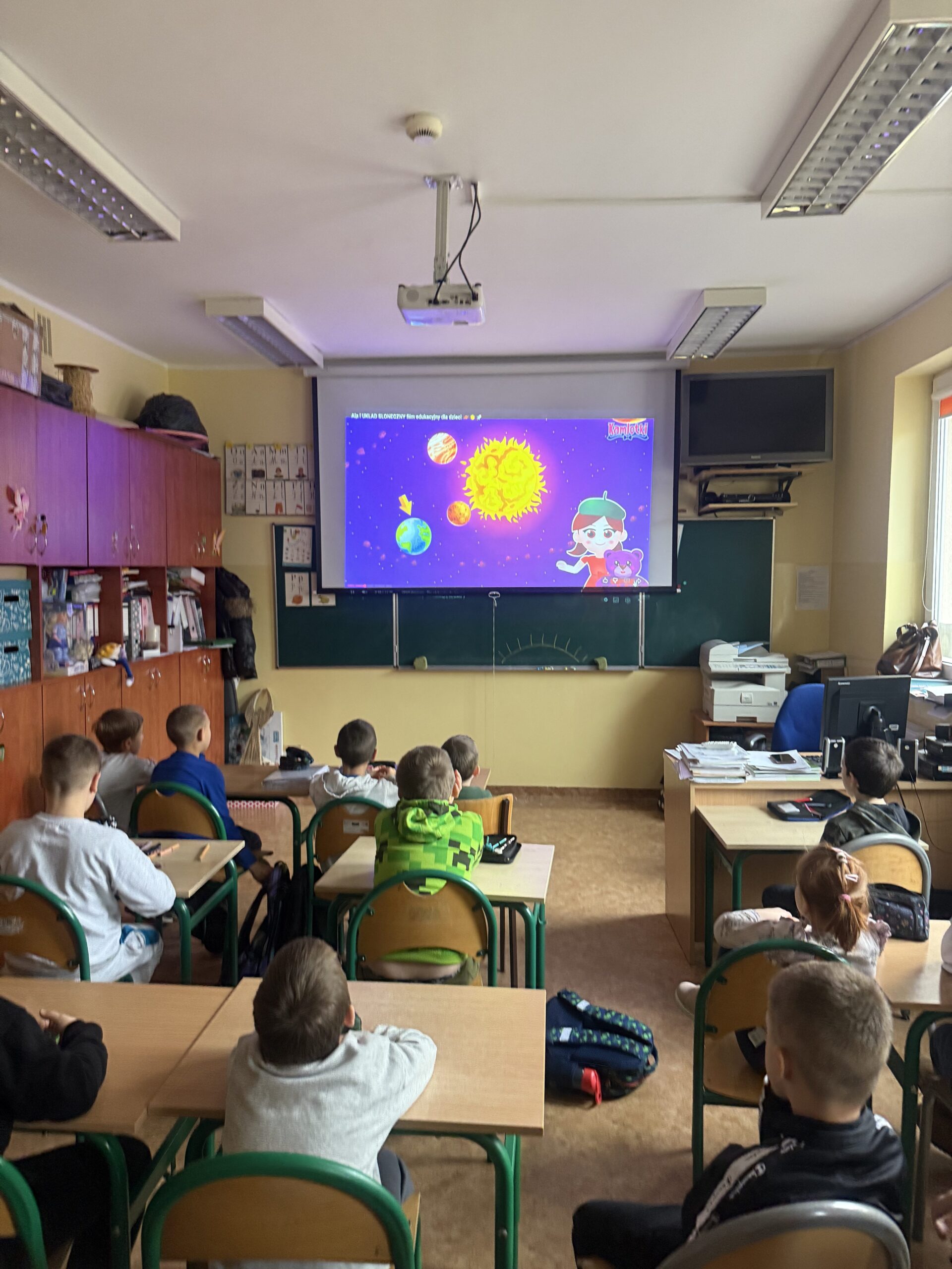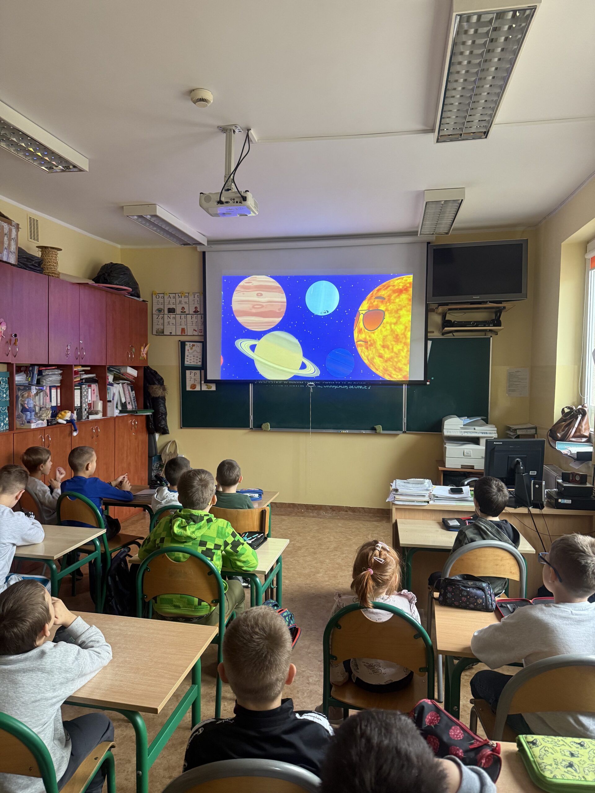 Uczniowie klasy I, II i III uczestniczyli w kolejnych zajęciach z projektu edukacyjnego „Razem w kosmosie”. Po wysłuchaniu piosenki „W układzie słonecznym”, omówieniu poszczególnych planet układu, poznaniu informacji o cechach charakterystycznych, został wyświetlony film edukacyjny. Następnie uczniowie rozwiązywali zadania do tematu zajęć i Quzi multimedialny sprawdzający wiedzę.