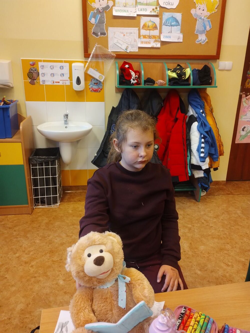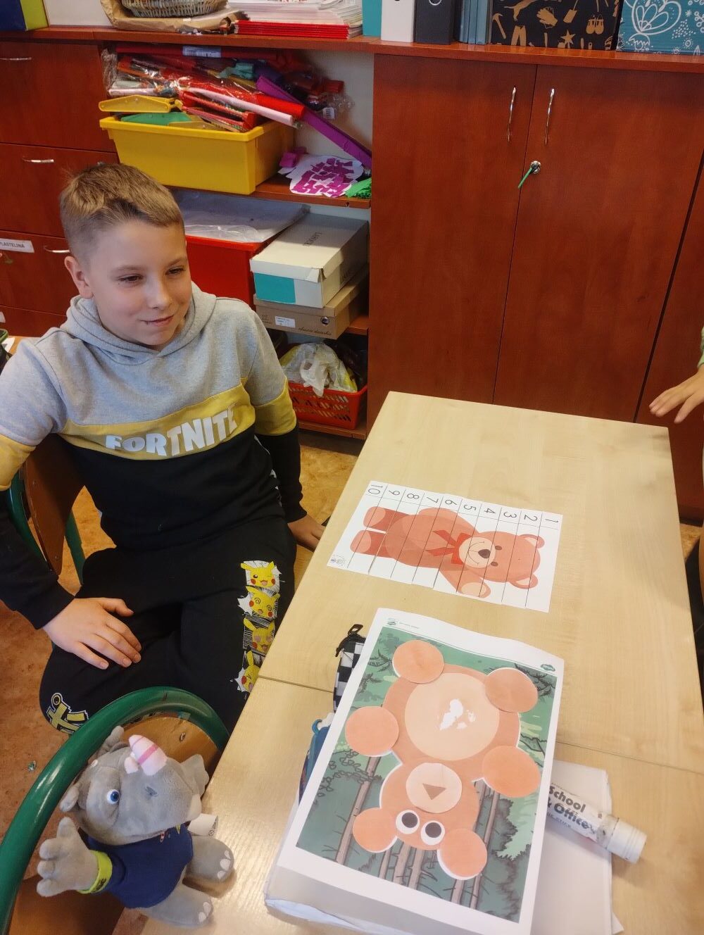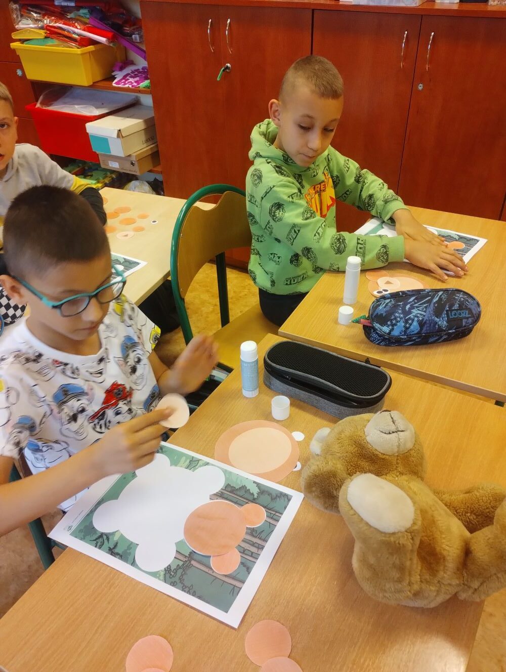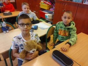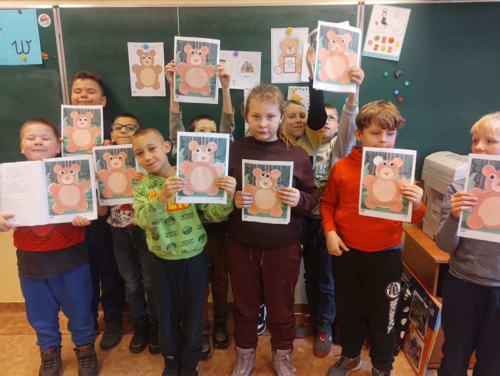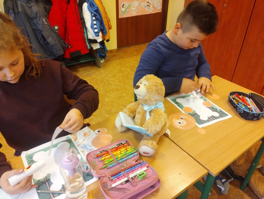 Następnie wykonały prace plastyczne, które polegały na wyklejaniu misia. Na koniec zajęć Pani Agnieszka przeczytała bajkę o Małym Misiu, która się dzieciom bardzo spodobała. Porozmawialiśmy również o swoich ukochanych pluszakach, które dzieci specjalnie przyniosły do szkoły, okazało się, że każdy z uczniów ma takiego przyjaciela, który jest z nim na dobre i na złe oraz do którego można się zawsze przytulić…
